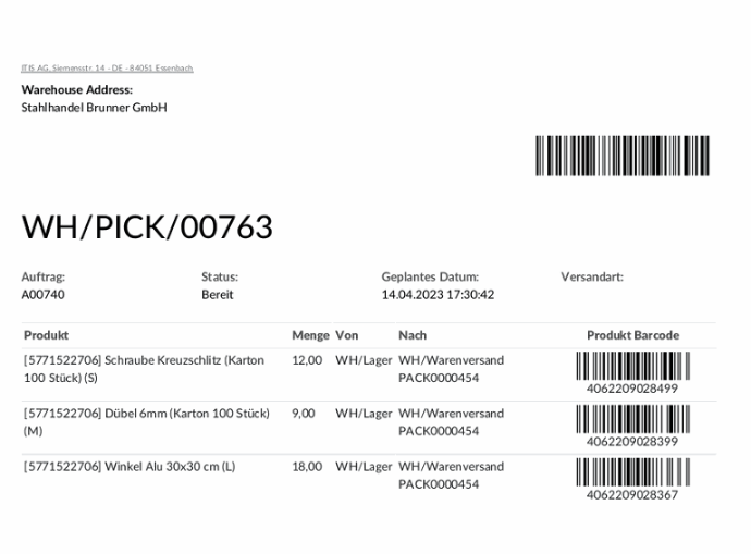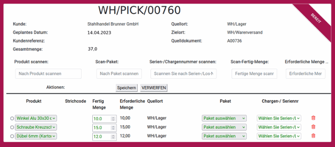 Nachdem ein Verkaufsangebot oder eine Bestellanforderung erstellt wurde, wird automatisch ein Verkaufsauftrag generiert. In der Folge wird ein Pickauftrag an das Lager gesendet und ein Lieferschein für die Verpackungsstation erstellt.