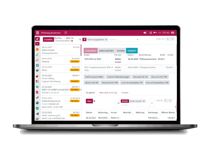 In Ihrem Unternehmen werden täglich Transaktionen abgewickelt. Sie erhalten Zahlungen von Kunden, oder begleichen Rechnungen Ihrer Lieferanten. Eine korrekte Buchhaltung sieht regelmäßig einen entsprechenden Rechnungsabgleich vor. Mit ITISeasy.business V18 und dem neuen Reconcile minimieren Sie dank umfassender Automatisierungsmöglichkeiten nicht nur den Zeitaufwand, sondern auch das Fehlerpotential.