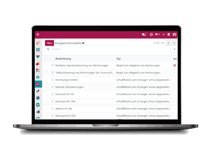 Zusätzliche Zeitersparnis im Abgleichs - Prozess erreichen Sie durch die Erstellung von Abgleichsmodellen . Diese basieren auf Ihren eigenen Kriterien und Regeln, wie z.B. Partner-Match, Beträge bzw. erlaubte Differenzen, Voreinstellungen für bebuchte Konten und wiederkehrende Buchungen. Rechnungen lassen sich so mühelos und eindeutig mit Bankdaten verknüpfen und bei Bedarf sogar automatisch ausziffern.