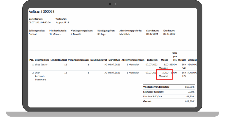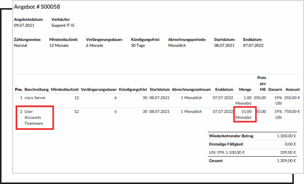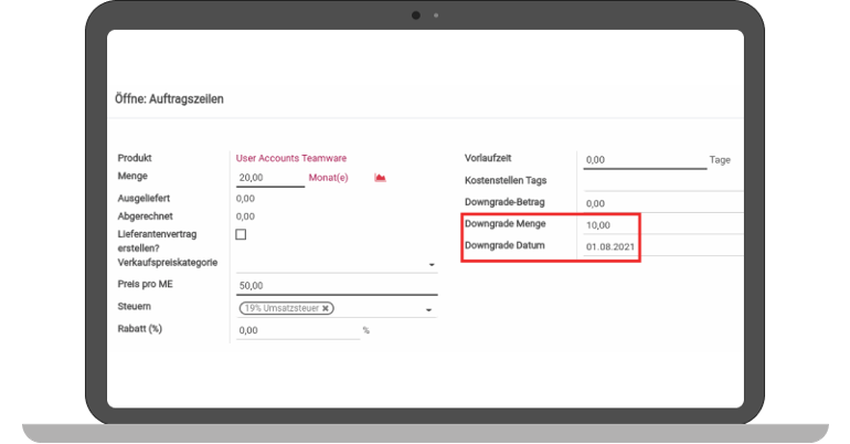 Staying with the same example, it's also possible that the number of Teamware account users decreases, and the customer wants to receive fewer products. With ITISeasy.business's downgrading function, this scenario is also covered in our solution.